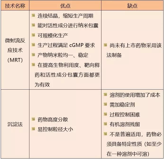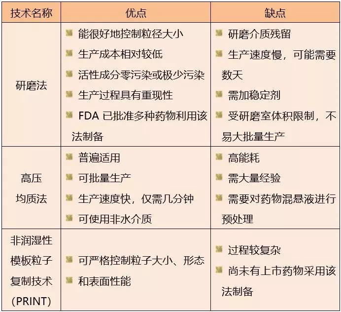 納米藥物制備方法有很多,例如機械粉碎、氣相沉積、液相反應……但是其中很多方法的制備條件要求很高,如熱蒸發法、等離子汽化沉積法、激光蒸發沉積法等,并不適合工業化的藥品生產。下面將目前適合制備納米藥物的方法進行優缺點比較,如下表: