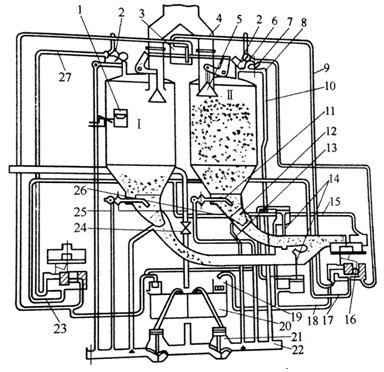 1-指示器;2-氣閥;3-汽缸;4-進(jìn)料管;5-進(jìn)料閥;6,9,15-壓縮空氣管;7-過濾器;8-節(jié)流閥;10,11,13-充氣管;12-噴嘴;14,24,25,26-閥門;16-電磁閥;17,18,23,27-空氣管道;19-止逆閥;20-阻滯器;21-減壓閥;22-壓縮空氣總管道;Ⅰ、Ⅱ——料倉