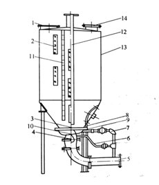 1-進(jìn)料口;2-觀察窗;3-噴嘴;4-止逆閥;5-進(jìn)風(fēng)管;6-清洗風(fēng)管;7-充氣管;8-充氣板;9-充氣室;10-氣室;11-料面標(biāo)尺;12-輸料管;13-泵體;14-排氣孔