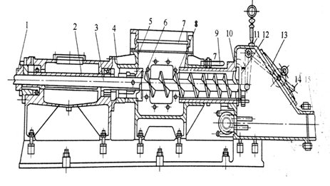 1-軸承;2-襯套;3-主軸;4-防灰盤;5-加料管口;6-密封填料函;7-喂料平閘板;8-螺旋壓片;9-料塞厚度調(diào)節(jié)桿;10-卸料孔口;11-重錘閘板軸;12-重錘閘板;13-檢修孔蓋;14-重錘杠桿;15-泵出口
