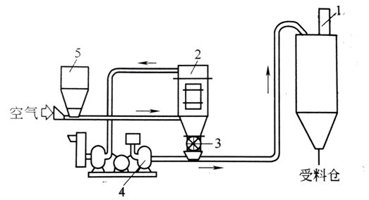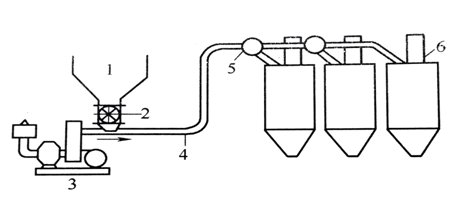 1-料倉;2-供料器;3鼓風(fēng)機(jī);4-輸送管;5-轉(zhuǎn)向閥;6-除塵器