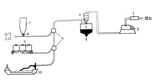 1-消聲器;2-引風(fēng)機(jī);3-料倉;4-除塵器;5-卸料閘閥;6-轉(zhuǎn)向閥;7-加料倉;8-加料閥;9-鐵路漏斗車;10-船艙