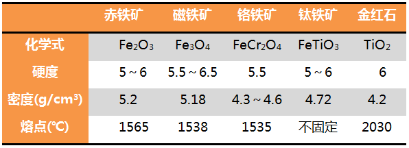 赤鐵礦、磁鐵礦、鉻鐵礦、鈦鐵礦和金紅石