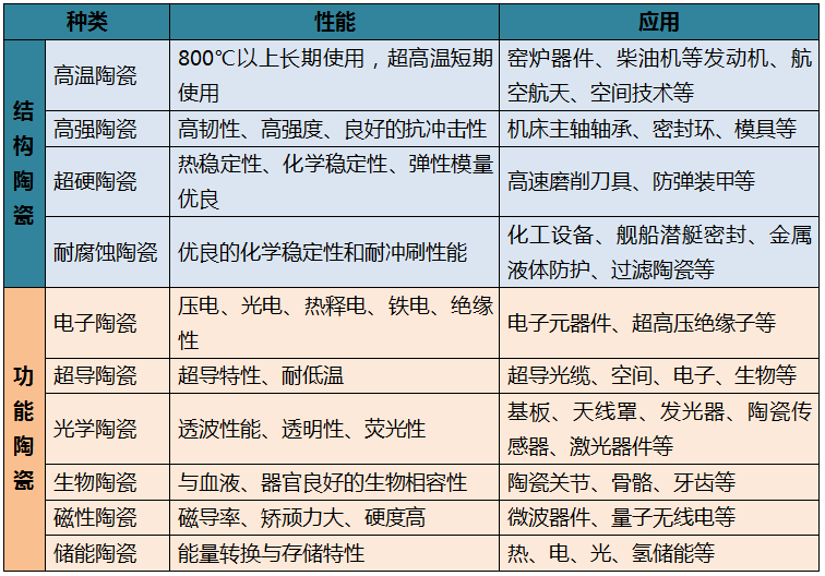 按性能和用途,先進陶瓷可分為功能陶瓷和結構陶瓷兩大類。功能陶瓷主要基于材料的特殊功能,具有電氣性能、磁性、生物特性、熱敏性和光學特性等特點,主要包括絕緣和介質陶瓷、鐵電陶瓷、壓電陶瓷、半導體及其敏感陶瓷等;結構陶瓷主要基于材料的力學和結構用途,具有高強度、高硬度、耐高溫、耐腐蝕、抗氧化等特點,主要包括氧化物陶瓷、氮化物陶瓷、碳化物陶瓷、硼化物陶瓷等。