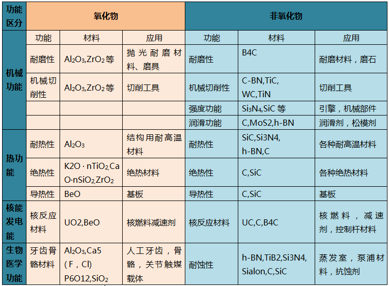 先進陶瓷應用性能分類