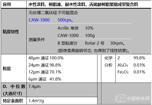 超疏水性填料 CAW-1000 是一種高純度二氧化硅, 具有最大的抗水性和疏水性。它是為了滿足對樹脂產品的嚴重耐水性要求而開發的。尤其有利于提高抗水性的性能。它使高負荷, 低粘性, 高色散成為可能。在丙烯酸系樹脂中應用, 大大提高了產品的強度。