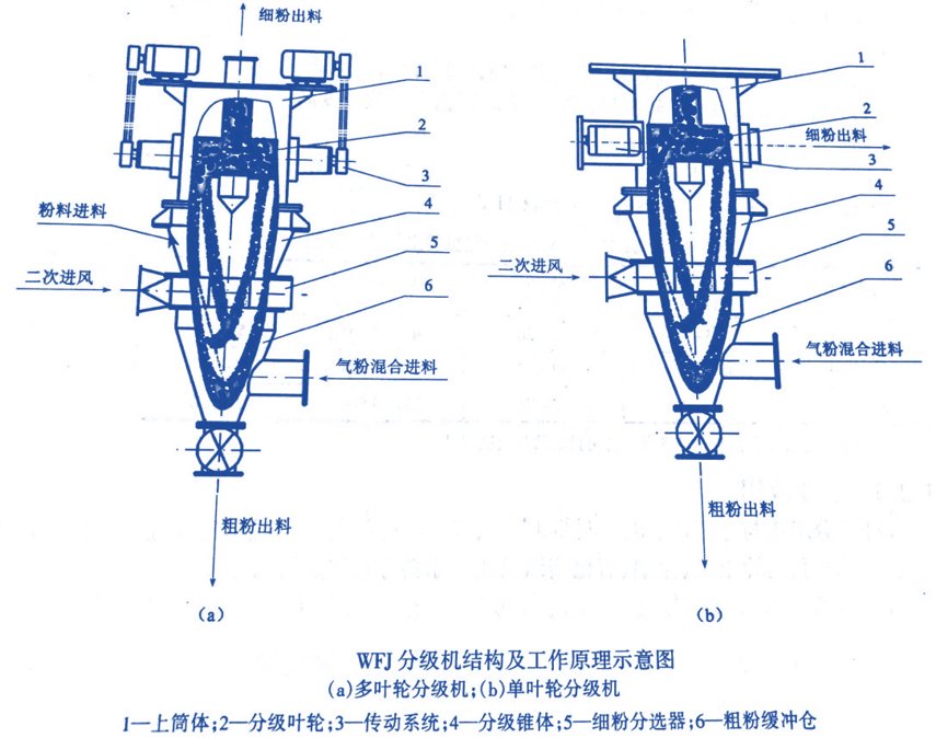 WFJ型分級(jí)機(jī)與球磨機(jī)、超細(xì)機(jī)械沖擊磨、氣流粉碎機(jī)等配套或單獨(dú)設(shè)置。已廣泛應(yīng)用于滑石、重鈣、高嶺土、氧化鋁、氧化鎂以及化工原料等粉體的精細(xì)分級(jí)。