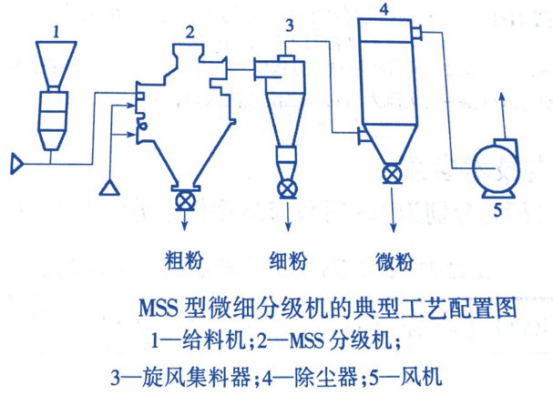 MS型和MSS型微細(xì)分級(jí)機(jī)常用于與高速機(jī)械沖擊式磨機(jī)、球磨機(jī)等配套使用構(gòu)成內(nèi)閉路超細(xì)粉碎作業(yè),以提高粉碎作業(yè)效率、控制產(chǎn)品細(xì)度和粒度分布。這種分級(jí)機(jī)在非金屬礦物超細(xì)粉體材料的加工中得到了廣泛應(yīng)用。