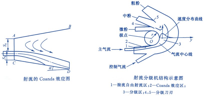 射流分級(jí)機(jī)是集慣性分級(jí)、迅速分級(jí)和微細(xì)顆粒的附壁效應(yīng)(Coanda效應(yīng))等原理于一身而進(jìn)行超細(xì)分級(jí)的分級(jí)設(shè)備。