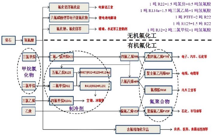 有機氟化工螢石下游需求占比最大領(lǐng)域,主要包括制冷劑、氟聚合物和中間體三類。