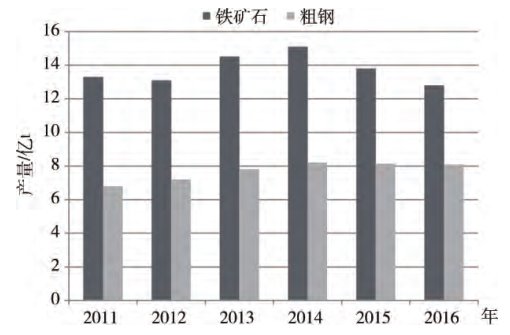 2011~2016年中國鐵礦石、粗鋼產(chǎn)量變化
