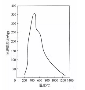 氫氧化鋁在煅燒的過程中比表面積隨溫度的變化如圖,在240℃時比表面積急劇增加,到400℃左右達到極大值。