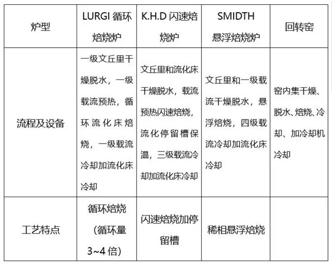 現在應用于工業生產的三種類型的流態化焙燒技術和裝置,與回轉窯相比,雖然都具有技術先進、經濟合理的共同點,但各種爐型各具特點,有人將氧化鋁焙燒分為三代:第一代為回轉窯,第二代為稀相與濃相液態化相結合的流態化焙燒,第三代為稀相流態化的氣態懸浮焙燒。