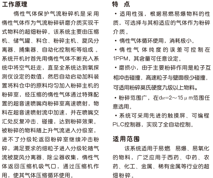 對易燃、易爆物料可用惰性氣體作為工作介質粉碎。