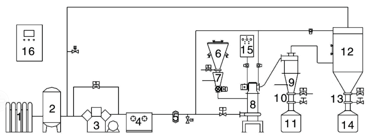 流化床氣流粉碎機是一種用高速氣流來實現干式物料超細粉碎的設備。它由粉碎噴嘴、分級轉子、螺旋加料器等組成。物料通過螺旋加料器進入粉碎室,壓縮空氣通過特殊配置的超音速噴嘴向粉碎室高速噴射,物料在超音速噴射流中加速,并在噴嘴交匯處反復沖擊、碰撞,達到粉碎。被粉碎物料隨上升氣流進入分級室,由于分級轉子高速旋轉,粒子既受到分級轉子產生的離心力,又受到氣流粘性作用產生的向心力,當粒子受到離心力大于向心力,即分級徑以上的粗粒子返回粉碎室繼續沖擊粉碎,分級徑以下的細粒子隨氣流進旋風分離器、捕集器收集,氣體由引風機排出。