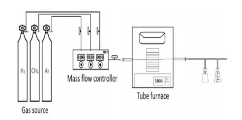 上圖為常壓下CVD法生長三維石墨烯的整個系統的示意圖。整個系統包括氣源、質量流量控制器、CVD 管式爐、氣體排除裝置和凍干裝置5大部分,其中氣體有 CH4、H2、Ar 3路氣體。