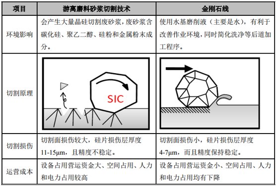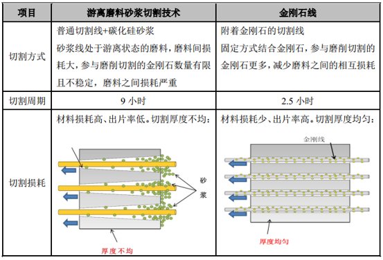 由上圖可見,近年來光伏企業(yè)競(jìng)爭(zhēng)加劇,晶硅光伏組件價(jià)格一路走低,這對(duì)硅片生產(chǎn)、加工企業(yè)提出了進(jìn)一步壓縮成本的要求。金剛石線切割法作為新的切割技術(shù),具有薄片化切割、減小切口損失、降低硅料損耗、提高加工效率、提高出片率、降低污水及 COD 排放等優(yōu)勢(shì),可以大幅降低硅片生產(chǎn)企業(yè)成本,提高硅片品質(zhì),下圖為金剛石線切割和砂漿切割方式對(duì)比。
