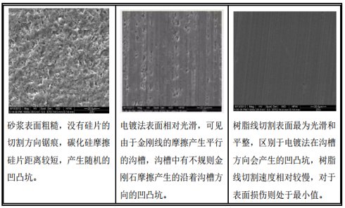 砂漿法、電鍍線法和樹脂線法切割硅片的表面效果圖