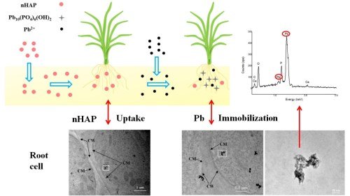 為此,固體所環境與能源納米材料中心研究團隊研究了水培條件下nHAP在水稻根細胞中的傳輸與分布,并探討了nHAP降低Pb在水稻體內的毒性和遷移性方面的機制。研究結果表明,nHAP (20±5 nm)進入水稻根部后可以作為阻擋層捕獲Pb2+,抑制了Pb2+從根部向地上部的轉運,進而降低Pb2+的生物毒害。其固定機制主要體現在通過水稻根細胞中存在的nHAP與Pb2+結合,并將Pb2+轉化為根細胞中的Pb沉積物,一方面減少Pb2+對根部正常生長的干擾;另一方面減少Pb2+向地上部分的遷移,最終達到對Pb2+的固定作用。相關結果不僅為環境納米材料在植物根細胞中固定Pb2+的作用機制提供了理論依據,同時為利用納米技術減少Pb在水稻體內吸收和轉移提供了技術支撐。這項研究對于保證區域農產品安全、提高稻米質量、保障人體健康等都具有重要意義。