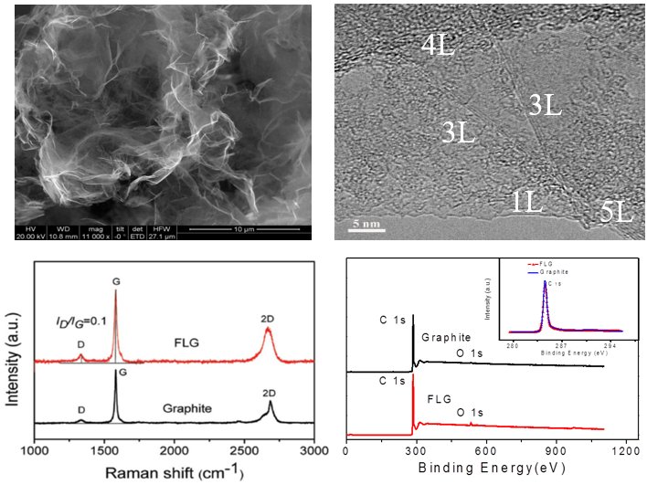 高質量薄層石墨烯(Few-layer graphene,GRF系列)是公司具有技術優勢的品牌產品。高質量薄層石墨烯幾乎不含任何官能基團和拓撲缺陷,厚度分布在1-10原子層,保持原始石墨片層的極好晶化質量,完好的層內sp2結構及優異的導電、導熱性能。掃描電子顯微鏡(SEM)和投射電子顯微鏡(TEM)顯示了超薄的石墨烯片層結構,Raman和XPS顯示了高晶化質量。