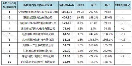 圖1:2018年3月國內動力電池裝機量排位前10企業情況