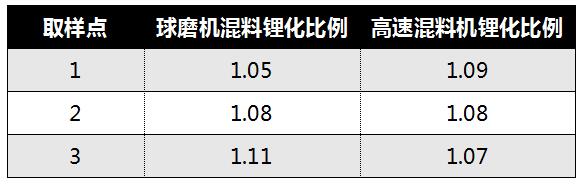 表2 球磨機(jī)和高速混合機(jī)混合后材料不同取樣點(diǎn)鋰化值對(duì)比