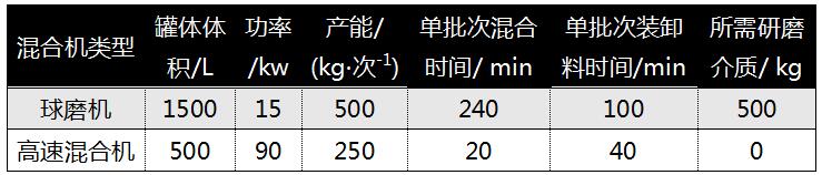 可見(jiàn)混合量相同時(shí),高速混合機(jī)所需時(shí)間較短,能耗相同。若按照表1中的參數(shù),500L的高速混合機(jī)日產(chǎn)能為6t左右,而1500L的球磨機(jī)日產(chǎn)能為2t左右。所以一臺(tái)500L的高速混合機(jī)的產(chǎn)能為一臺(tái)1500L球磨機(jī)的三倍。