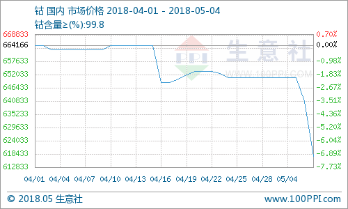5月4日,國內金屬鈷市場均價617500.00元/噸,單日鈷價下降2.3萬元/噸,跌幅3.64%;國內主要廠家出廠價暴跌,單日出廠價均價下跌4萬元/噸,跌幅6.06%。鈷價在持續了一年多的暴漲之后,在4月份開始震蕩下跌,并在5月初鈷價出現暴跌。