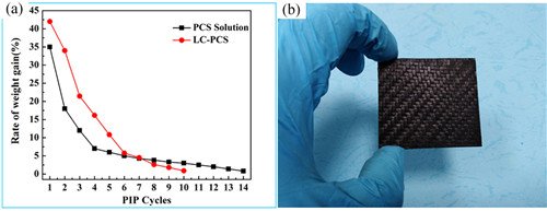 圖2(a)LC-PCS和PCS溶液浸漬周期-增重曲線;(b)LC-PCS為先驅體所制得2D Cf/SiOC