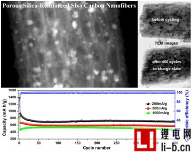 基于二氧化硅(SiO2)作為填料可以提高復合材料機械性能這一現象,西安交通大學電氣學院牛春明千人團隊王紅康老師課題組設計并成功制備了一種SiO2增強的多孔Sb/C纖維復合材料。利用靜電紡絲法將硅源(硅酸乙酯)、銻源(三氯化銻)和碳源(聚乙烯吡咯烷酮)制備成纖維結構,再通過熱處理一步形成了多孔碳纖維包覆SiO2和Sb納米顆粒的獨特結構。SiO2的引入大大增強了纖維的整體結構穩定性。作為鋰離子電池負極材料,所得SiO2/Sb/C多孔纖維電極在半電池和全電池測試中均顯示了優異的電化學性能。碳纖維不但提高了電極材料的導電性,而且其多孔結構有效消納了SiO2和Sb在嵌/脫鋰過程中體積變化。通過原位和非原位電鏡表征,進一步揭示了該材料在嵌/脫鋰過程中的結構穩定性。該工作提出的電極材料結構增強思路,即利用SiO2增強效應(Silica-Reinforcement Effect)同步實現了電極結構穩定性和儲鋰性能的雙提升,且該方法具有通用性( Materials Today Energy 2016, 1–2, 24-32;Nanoscale 2016, 8, 7595-7603)。