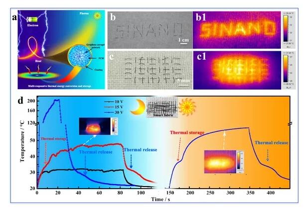 圖1 、石墨烯氣凝膠智能纖維的多重刺激響應示意圖(a)、其編織圖案的光學照片(b, c,)與光-熱響應時的紅外照片(b1, c1)、及其智能織物(d內插圖)在光/電刺激響應下的熱能轉換與存儲/釋放的歷程(d)。