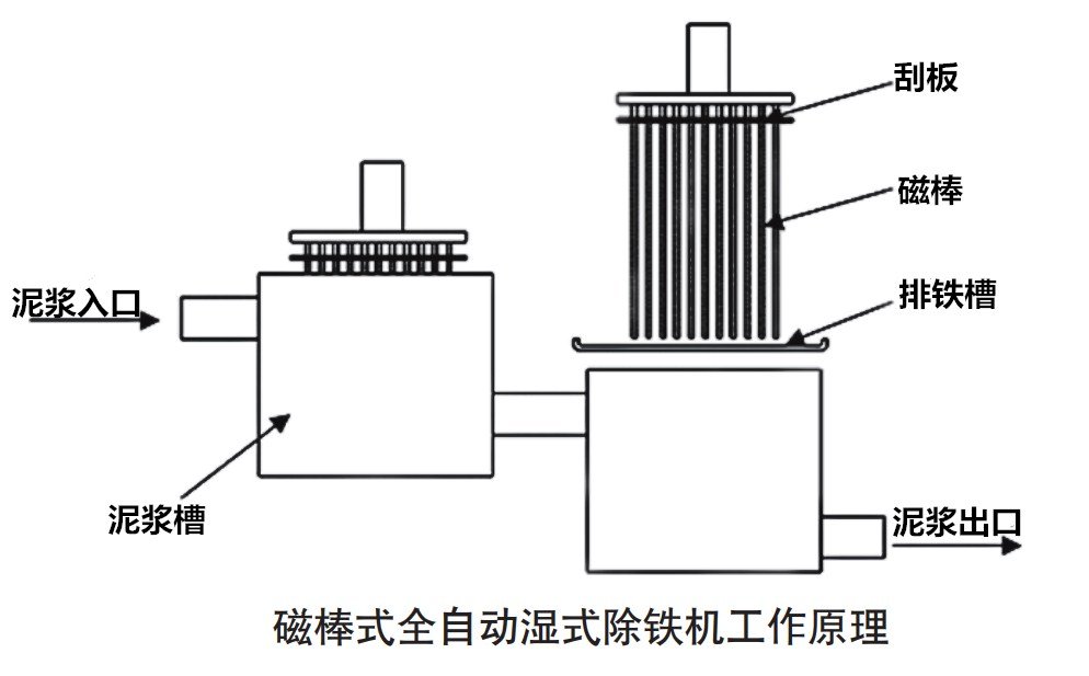 磁棒作為陶瓷企業最早使用的除鐵器件,最大特點是無能耗、無污染、可安裝于生產線上能與物料接觸的任意位置,節約空間,安裝方便,結構簡單,使用壽命長,故在陶瓷生產中仍被廣泛使用。但其推廣使用還存在以下困難:磁棒投入量大,由于泥漿與磁棒直接接觸,磁棒受泥漿的溫度影響很大,泥漿的溫度波動會導致磁棒的磁性能衰減很快,磁棒使用壽命縮短,而且磁性物質清洗不徹底等等。