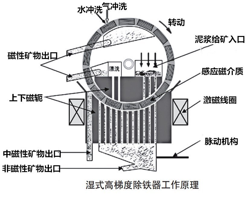從結構上,它結構緊湊,占地面積較少,采用轉環式結構可實現單機連續性操作,處理量較大,中等大小的單機每小時可處理泥漿100t以上;此外,脈動機構可有效防止礦漿在工作區域的堵塞,水氣兩種沖洗方式也可使清洗更加徹底,這種設備裝對陶瓷原料的除鐵有很好的應用前景。