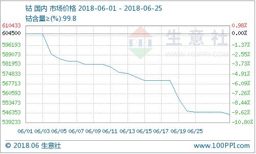 6月25日,國內鈷價報價下跌,實際成交價暫穩,國際鈷市熱錢退出,鈷價沒有暴增的動力支撐,鈷價更多受供需關系影響。2018年以來,鈷礦開采量大增,鈷市供給上漲;在需求方面,新能源汽車仍處高增長階段,對鈷價有一定支撐作用,但近期美中貿易戰升級,宏觀經濟受影響整體看跌,有色金屬板塊受拖累全線下跌,鈷未來需求行情看跌。國際鈷市供給增多,金屬鈷短期出現供給過剩,后市鈷價震蕩調整,但鈷市總體需求仍在,鈷價難跌破50萬元/噸心理價位。