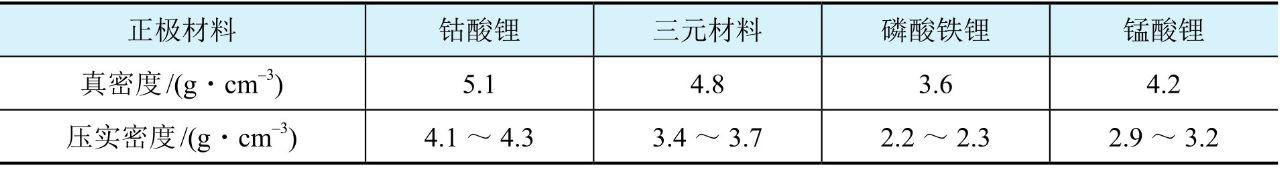 幾種商業正極材料的真密度和壓實密度范圍