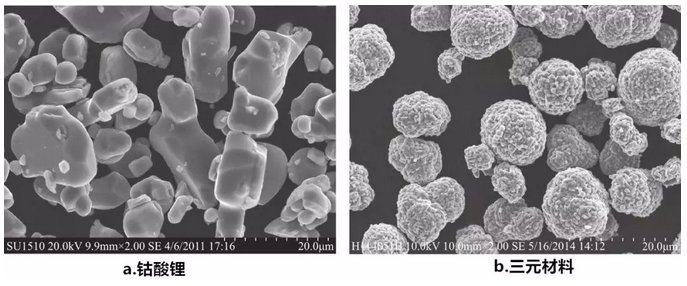 三元材料和鈷酸鋰的真密度差別并不大,從上表可以看出,NCM111和鈷酸鋰的真密度只差0.3g·cm-3,壓實密度卻比鈷酸鋰低0.5g·cm-3,甚至更高,導致這個結果的原因很多,但最主要的原因是鈷酸鋰和三元材料的形貌差別。
