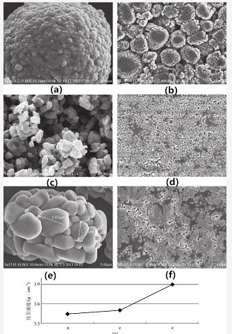 圖中(a)、(c)、(e)三種形貌的材料對應的壓實密度結果對應(g)中的a、c、e。從圖中可以看出,(a)形貌的材料壓實密度最低,但和(c)的壓實密度相差不多,(e)的壓實密度比(a)和(c)的高很多,已經達到3.9g·cm-3。