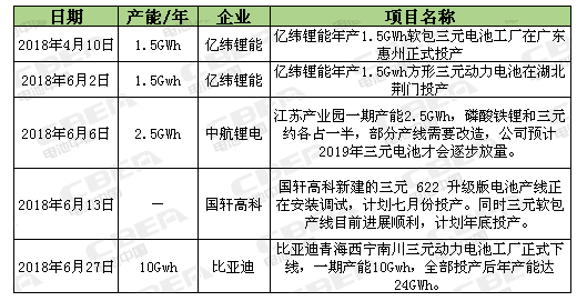 圖1:2018年上半年三元電池投產或預計投產項目匯總