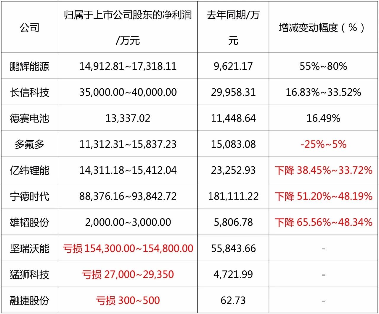 從上表可以看出10家公司中只有三家歸屬于上市公司股東的凈利潤有所增長,4家公司下降,剩余3家公司出現不同程度的虧損。就連動力電池的龍頭企業寧德時代歸屬于上市公司股東的凈利潤也大幅下降。