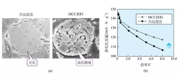 三菱化學用MCC方法制備出一種內部為多孔結構的三元材料,如圖(a)所示。圖中左邊為常規共沉淀法制備的材料,可見材料內部密實無孔洞。圖中右邊為MCC法制備的材料,其內部有大量孔隙。兩種材料的倍率性能見圖(b),可看出內部有孔隙的材料倍率性能明顯優于內部密實的材料。
