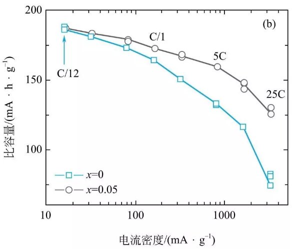 從圖中可以看出,在低倍率下(C/12)兩種樣品的容量無差別,但隨著充放電倍率的增大,高鋰化配比的樣品倍率性能明顯好于低鋰化配比的樣品。研究人員認為高鋰化配比材料倍率性能優異的原因是其具有較高的電子電導率。