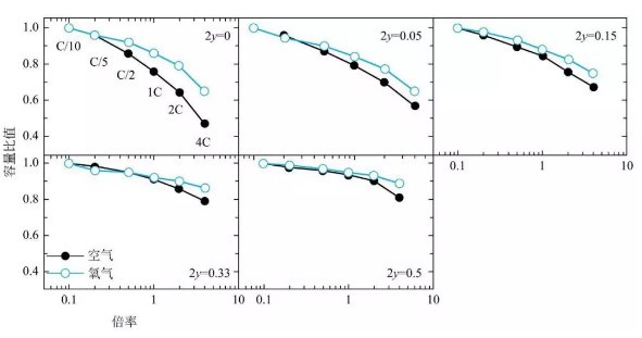煅燒氣氛分別為氧氣和空氣。從圖中可以看出,在0.1C和0.2C情況下,空氣氣氛和氧氣氣氛材料并無明顯差別,但隨著倍率的上升,氧氣氣氛下煅燒的材料倍率性能優于空氣煅燒的材料。且五種不同組分的材料都有相同的變化趨勢。但氣氛對不同組分的材料影響效果略有差異。研究人員認為氧氣氣氛減少了材料的陽離子混排,從而使材料擁有較好的倍率性能。