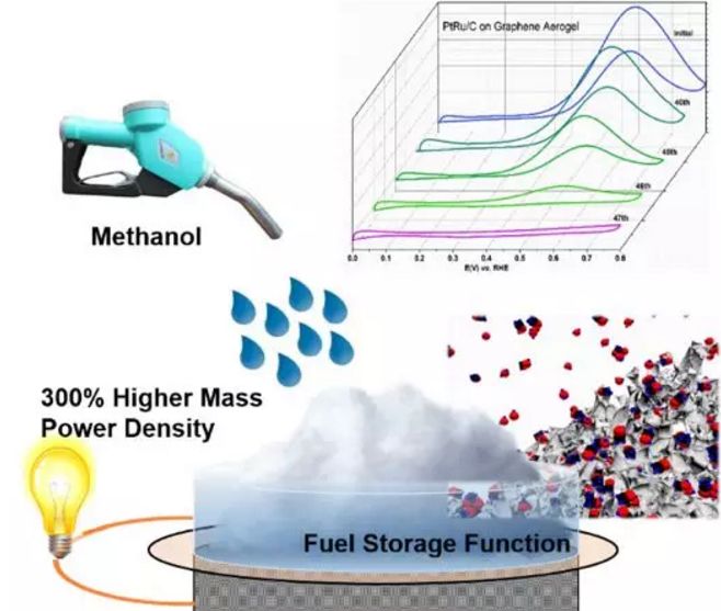 中國粉體網訊 此項工作利用石墨烯氣凝膠良好的導電性能,優異的機械性能,高催化劑負載性能和超輕的質量,用石墨烯氣凝膠替代傳統燃料電池中的兩個重要組建---電極板和氣體擴散層,大大降低燃料電池重量的同時將燃料電池的質量功率密度提升了3倍。石墨烯氣凝膠具有特殊的選擇吸附性,即使將12M的甲醇存儲在氣凝膠中,甲醇也幾乎不會穿過質子交換膜。此外,石墨烯氣凝膠還起到了燃料存儲的作用,使得該燃料電池在無需持續輸送甲醇的情況下維持運行,從而省去了外接甲醇存儲裝置和復雜的燃料循環系統,并降低了制作成本。這項工作對燃料電池的進一步發展起到了重要的推動作用。