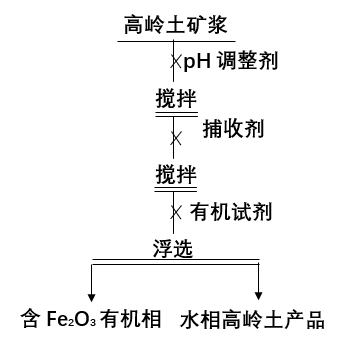 雙液浮選法是將高嶺土調(diào)制成一定濃度的水溶液礦漿,加入pH調(diào)整劑調(diào)節(jié)pH至所需值,攪拌后加入捕收劑,繼續(xù)攪拌一定時間后加入有機(jī)溶液,再充分?jǐn)嚢韬箪o置分層、分離,得到水相產(chǎn)品(含高嶺土)和有機(jī)相產(chǎn)品(含F(xiàn)e2O3)。