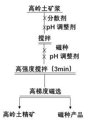 調(diào)節(jié)高嶺土礦漿的pH=8~11,加入Ca2+、Mg2+等堿金屬離子能使鐵鈦雜質(zhì)選擇性凝聚,再用弱陰離子聚合電解質(zhì)進(jìn)行選擇性絮凝。用高分子絮凝劑對高嶺土進(jìn)行選擇性絮凝時,高嶺土顆粒相互絮凝沉向底部,鐵鈦雜質(zhì)因其顆粒微細(xì)而存在于上部的懸浮液中且呈紅褐色,將上部的懸浮液除去即可除去大部分的鐵鈦雜質(zhì),再用其他方法 (如磁選)加以處理即可得到高品質(zhì)的高嶺土。