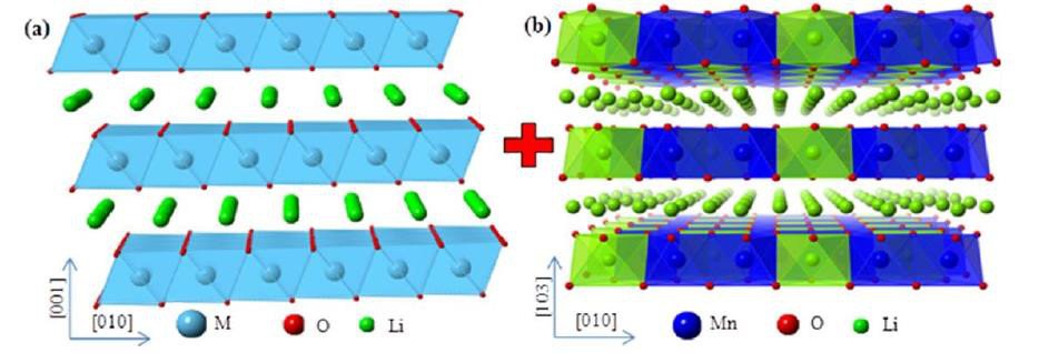 (a)六方LiMO2,(b)單斜Li2MnO3的晶體結構