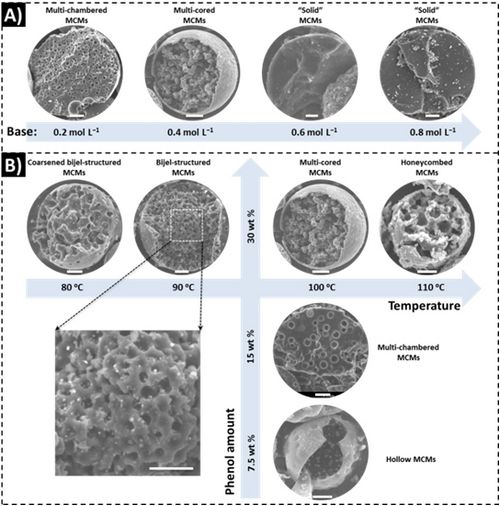 圖1. SEM圖像:微球的內部結構隨(A)堿濃度,(B)溫度和苯酚量的演變。標尺=10 μm。