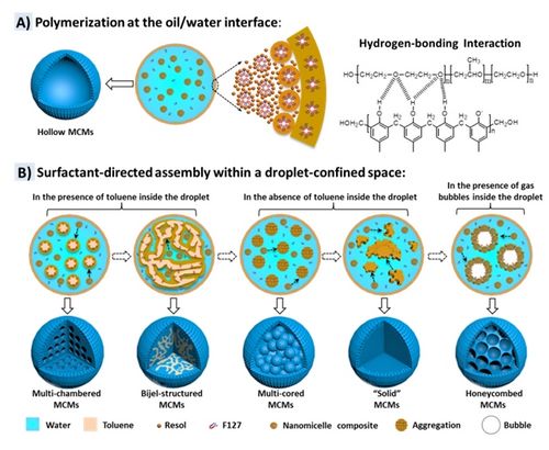 圖2.碳微球及內部結構形成機理的示意圖。(A)界面聚合;(B)內部結構的演變。