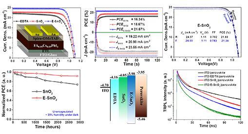 最近,該團隊利用乙二胺四乙酸(EDTA)與氧化錫絡合,成功制備了一種性能優異的E-SnO2電子傳輸材料,基于此材料的平面型鈣鈦礦太陽能電池的效率突破21.60%(認證效率達21.52%)。E-SnO2電子傳輸材料較高的電子遷移率,以及合適的能級位置有效抑制了鈣鈦礦太陽能電池中離子遷移和正、負電荷傳輸失衡導致的界面處電荷積累,基本消除了平面型鈣鈦礦太陽能電池中的滯后效應。此外,在E-SnO2電子傳輸材料上生長的鈣鈦礦吸光層具有較大的晶體顆粒,大大降低了鈣鈦礦材料在晶界處的降解幾率,提升了平面型鈣鈦礦太陽能電池的環境穩定性。此項研究成果為制備高效穩定的平面型鈣鈦礦太陽能電池奠定了基礎。
