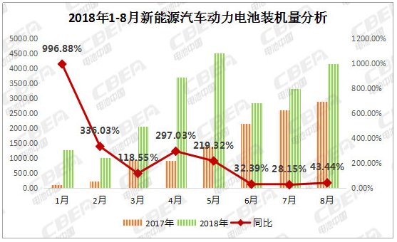 中國粉體網(wǎng)訊 動力電池應用分會研究部分析數(shù)據(jù)顯示,2018年8月,我國新能源汽車動力電池裝機量約4.17Gwh,環(huán)比增長24.9%,同比增長43.44%;1-8月累計裝機總量約22.97Gwh。